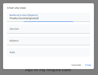 En el cuadro de diálogo tenemos espacios para poner título al cátedra, al nivel que estamos trabajando y la materia de la que manejo. No es necesario guatar todos los items pero conviene, al menos poner un nombre. Clic en “CREAR”