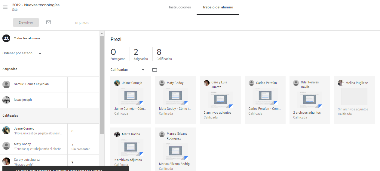 En la medida en que los alumnos entreguen sus tareas podemos consentir al panel de recibimiento. Allí vemos quién entregó y tenemos un espacio para catalogar.