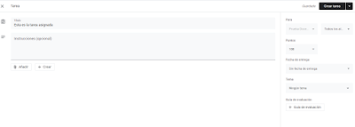 Crear + habilita las acciones requeridas para dejar tareas a los alumnos. Aquí podemos dejar los trabajos prácticos con todos los materiales necesarios. Nos permite enlazar archivos de Drive, adjuntar archivos de todo tipo, insertar videos de Youtube o dejar cualquier enlace.